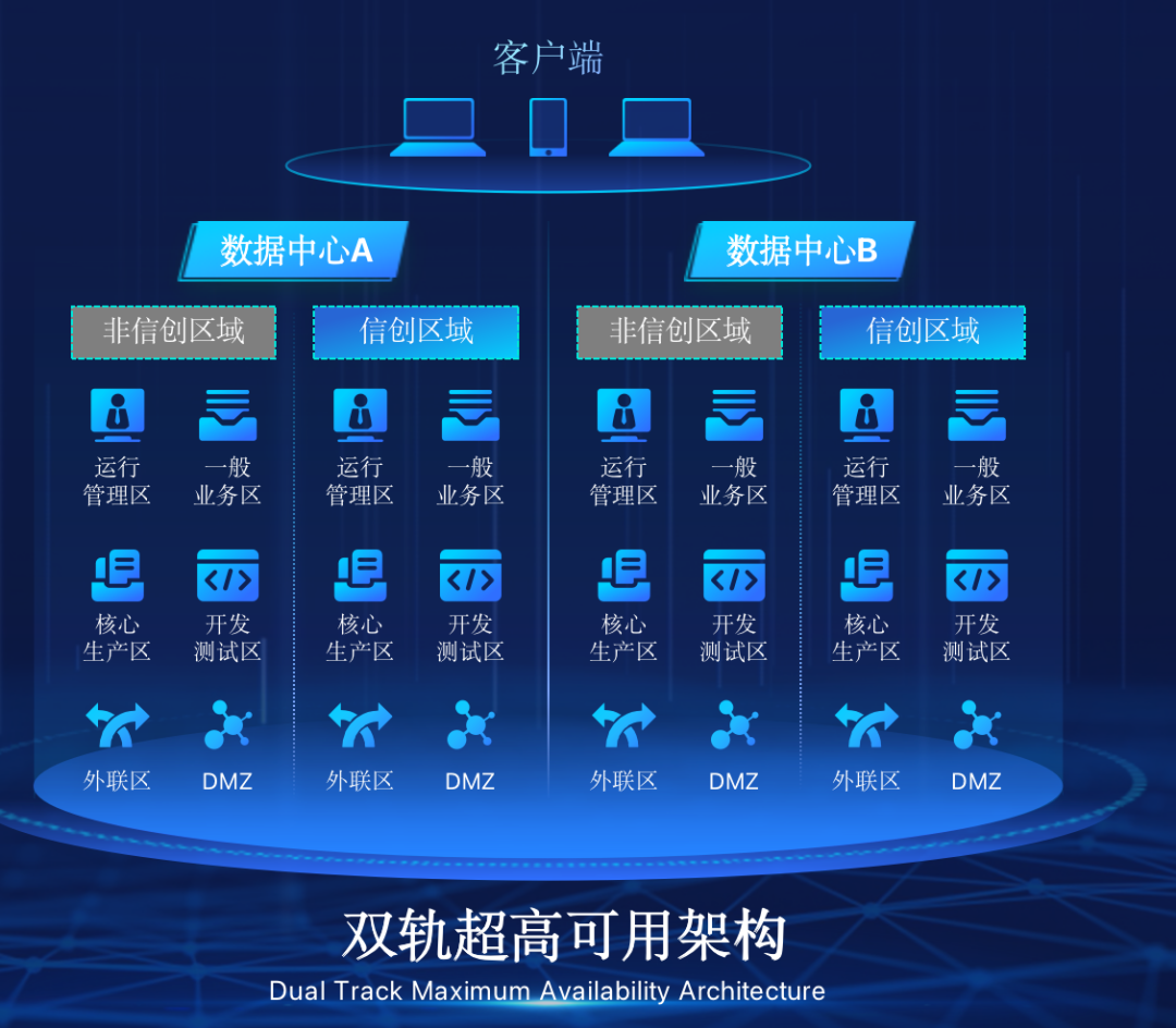 顺发配资在企业面临自主创新IT基础重构过程中,推出的全新架构双轨超高可用架构(简称DTMAA),在双活数据中心的分区调度基础上,添加每个数据中心内信创域和非信创域的分域调度,来实现分区分域协同的多活双轨超高可用。